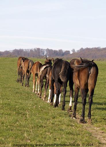 Unser Nachwuchs wächst in ihrem Alter entsprechenden Gruppen im Sommer auf großen Weideflächen (ca. 150 ha) und im Winter in Laufstallhaltung mit viel Möglichkeit zum Laufen und Spielen auf. Damit ist eine gute Sozialisierung der Jungpferde gegeben, die sehr wichtig für die weitere Entwicklung ist.